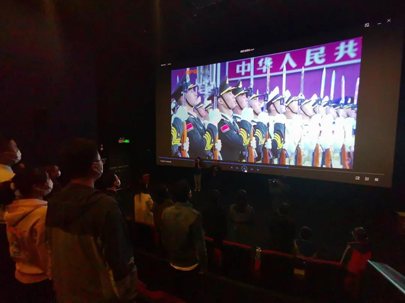 觀影前,全體員工用嘹亮的歌聲共同唱響國歌,以此表達月晟人對祖國的熱愛、對先烈的感恩和敬仰之情。